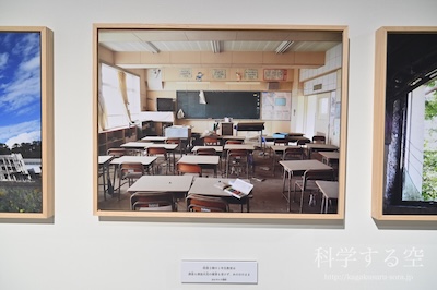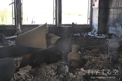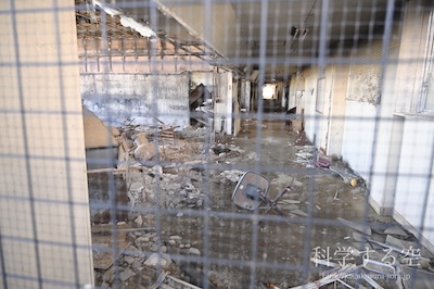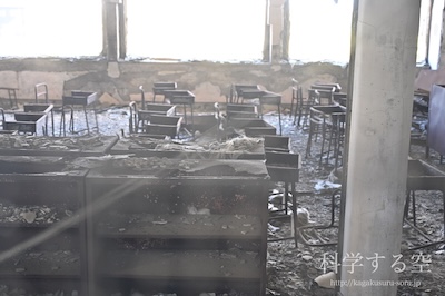 | 津波火災によって木でできたもの(机の天板)は全て燃えている。 | 津波・火災の被害を受けていない教室もある。立ち入りはできないが、当時のまま保存されている。 |